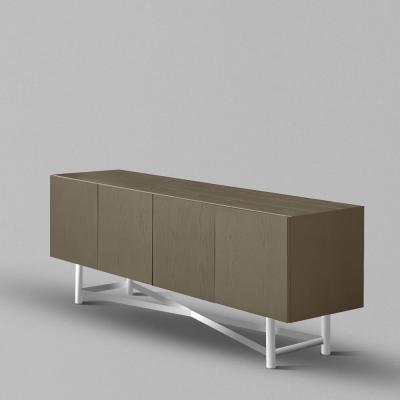 این میز تلویزیون از پایه های پیوسته فلزی و بدنه چوبی ساخته شده است. شکل ساده بدنه در ترکیب با پایه های ضربدری شکل تکمیل می شود .این میز تلویزیون از 4 قفسه داخلی تشکیل شده است که با درب هایی در سرتاسر نمای میز تلوزیون جدا شده است .