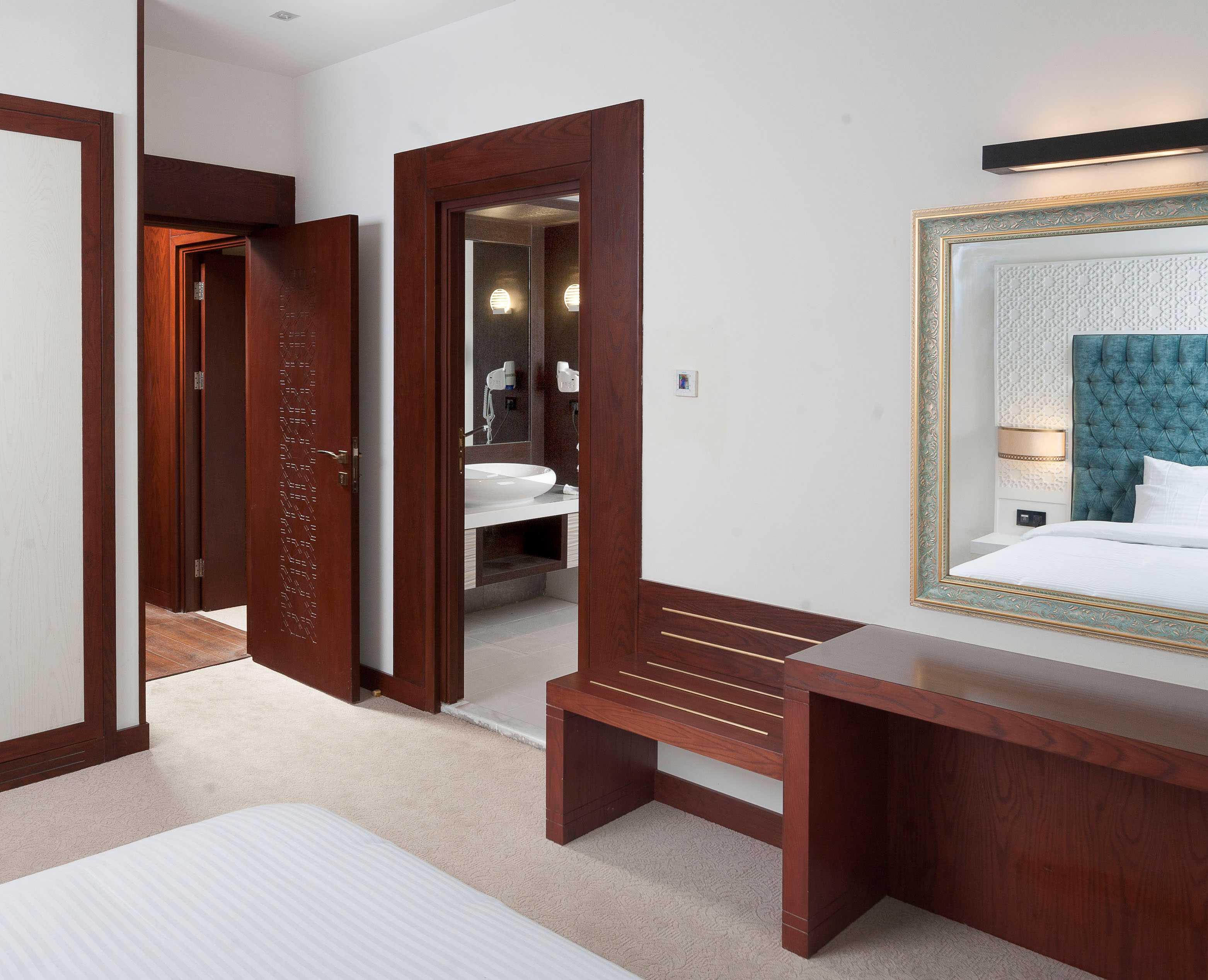 توجه به جزئیات و ظرافت هایی در طراحی دیتیل ها نظیر طرح سرتخت و قاب پرده و نقوش روی درب ها فضای طراحی داخلی اتاق ها در این هتل منحصر به فرد می کند .