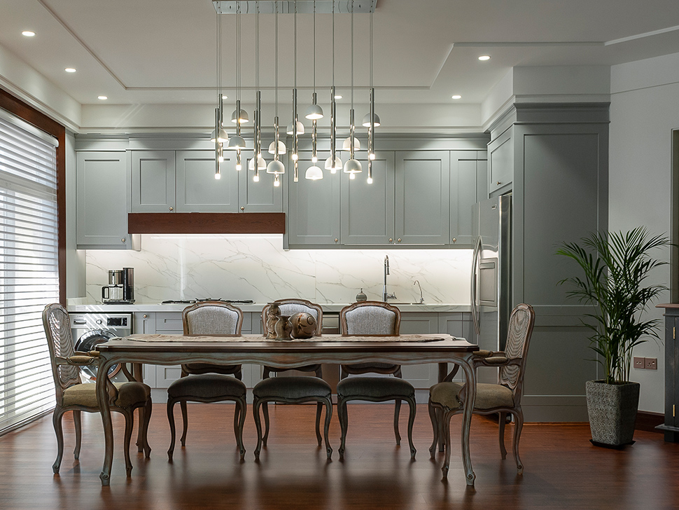 استفاده از درب های قاب دار نئوکلاسیک در تناسب با طرح کابینت های آشپزخانه یکپارچگی و طراحی هماهنگ دکوراسیون داخلی را به نمایش می گذارد.این درب ها به صورت درب های شیشه خور یا ساده به تناسب فضای طراحی استفاده می شوند.