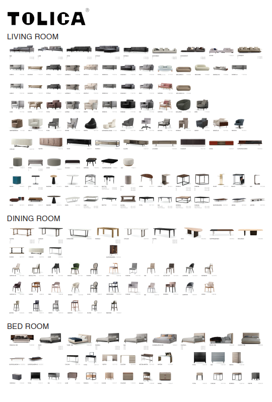 در شرکت تولیکا به منظور یکپارچه سازی سیستم فروش و کمک به طراحی داخلی یکپارچه از نظر سبک و شکل اجزای مبلمان ، کلیه محصولات در سه دسته کلی مبلمان پذیرایی ، سرویس خواب و سرویس نهارخوری ارائه می شود .هر یک از محصولات دسته های مختلف مبلمان با توجه به عواملی نظیر شکل پایه ، سبک و سیاق طراحی و... زیر مجموعه ده کانسپت اصلی تولیکا قرار می گیرند .